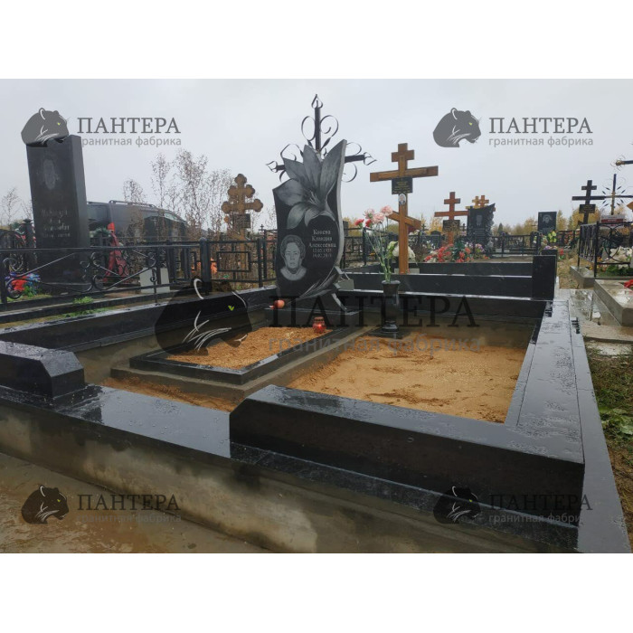 Гранитная ограда Ц10 веет минимализмом и легкостью, имеет резной цоколь у входа из черного гранита.