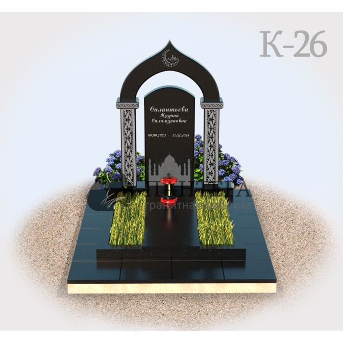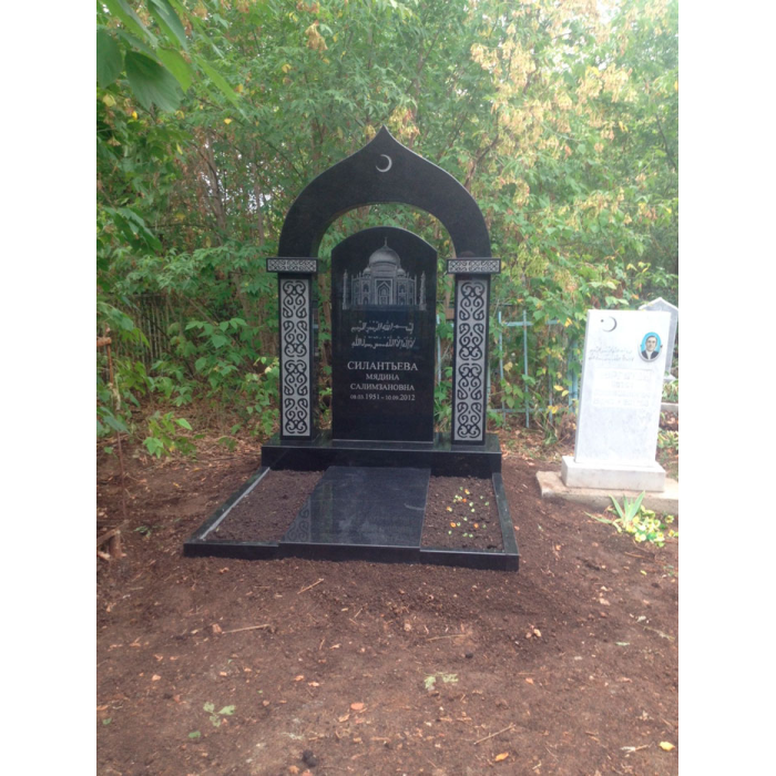 Поистине удивительный и неповторимый мусульманский комплекс из гранита с аркой разработали профессионалы гранитной Фабрики Пантера. Религиозные оттенки веют от очерка купола с аркой, восточной росписи на монументе, во главе с полумесяцем. Мемориальный комплекс рассчитан на участок 2*2м. Памятник изготовлен из камня, который является достоянием Республики Карелия. Гранит составит конкуренцию любой другой горной породе, потому что он плотный, твердый и прочный, не страшны ему влага, морозы и перепады температур.