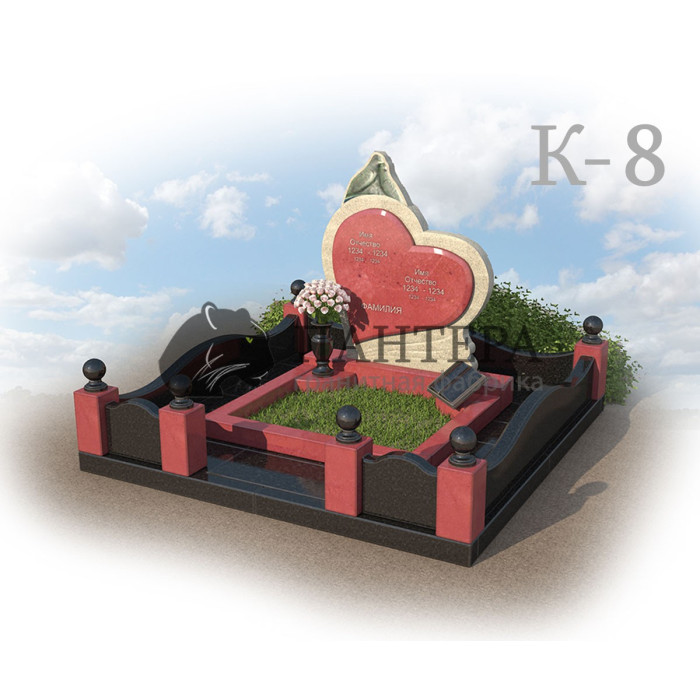 ♦ Интересное решение легло в основу гранитной ограды. Чередуя строгие малиновые столбики с гранитными шарами и округлым цоколем, повторяя плавные формы сердца, дает нам прекрасный ансамбль композиции в целом.